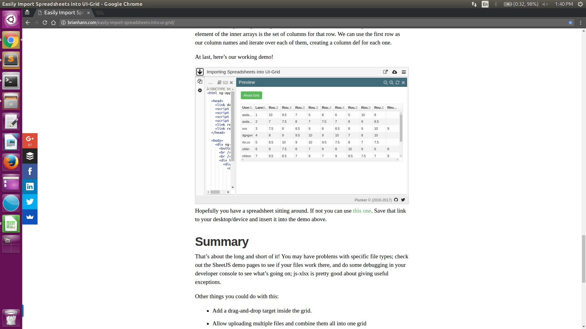 By: Brian Hann https://brianhann.com/easily-import-spreadsheets-into-ui-grid/#comment-306 Fri, 10 Feb 2017 15:31:00 +0000 https://brianhann.com/?p=565#comment-306 Can’t tell what’s going on; you’ll need be very specific about the issue and provide some details.
